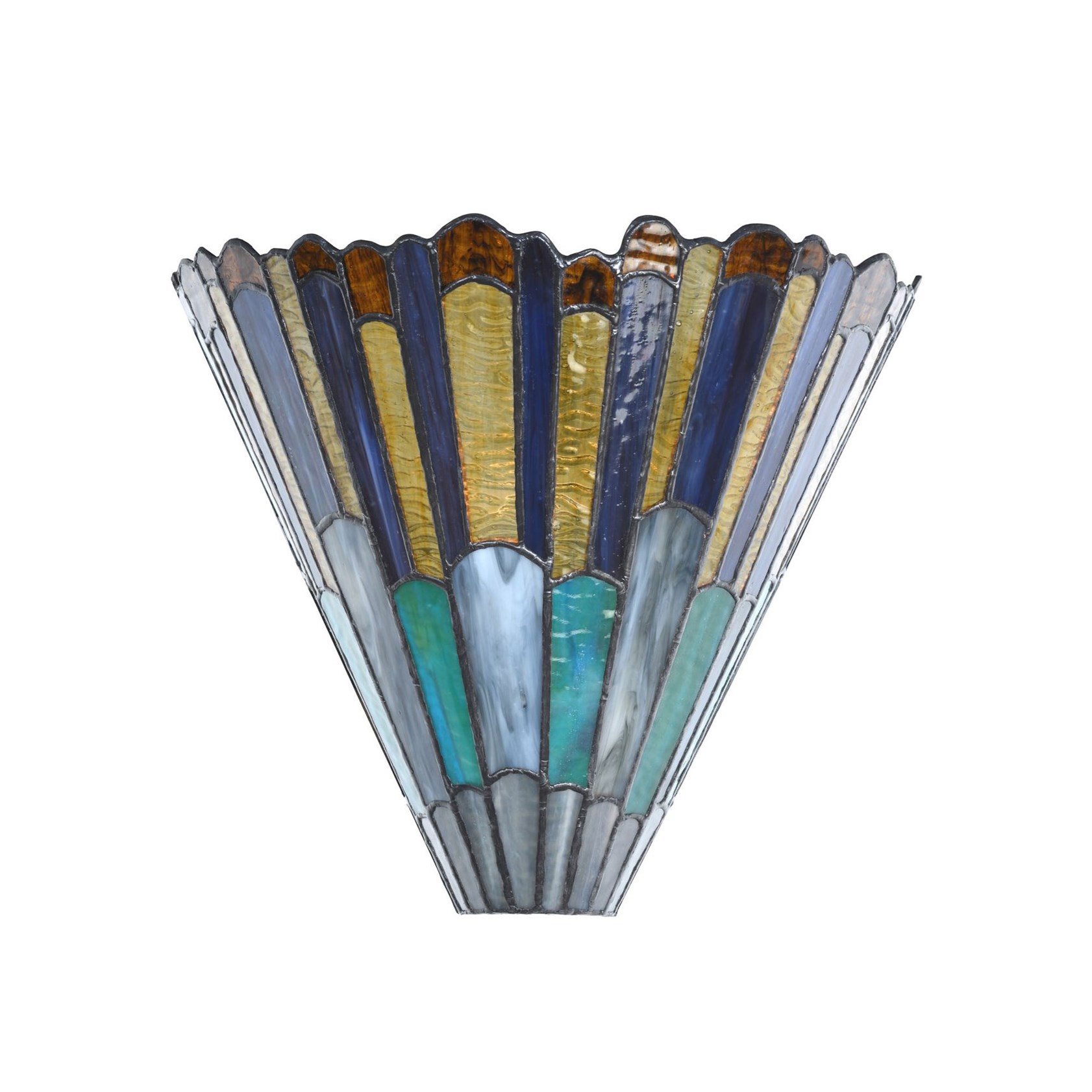 Graceful Tiffany wall lamp. The shapes and colors clearly have their origins in nature. The glass shade is imaginatively shaped like a fan. The pattern, shape and deep colors of emerald green and royal blue resemble a budding flower bud, but are also reminiscent of the feathers of a peacock in full glory.