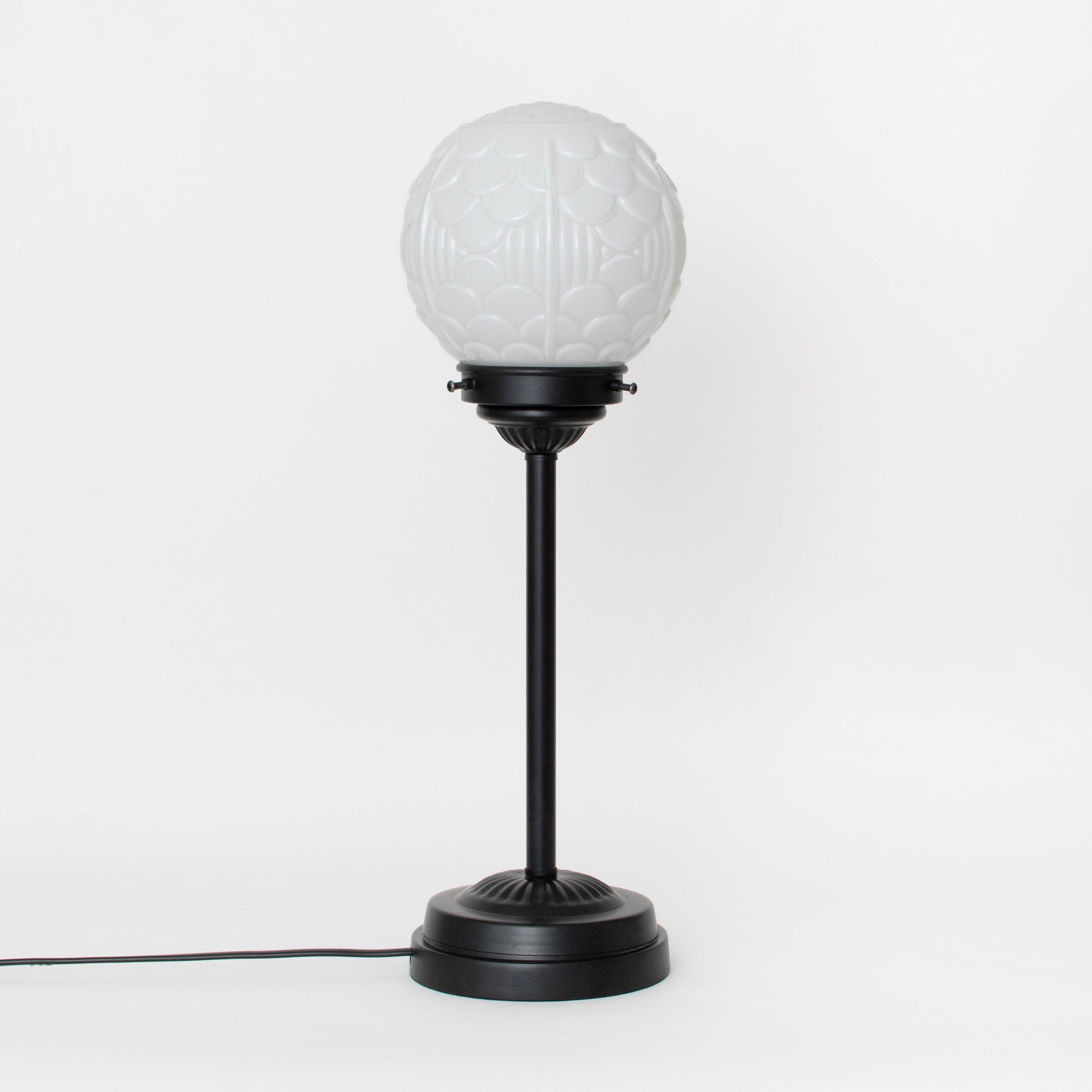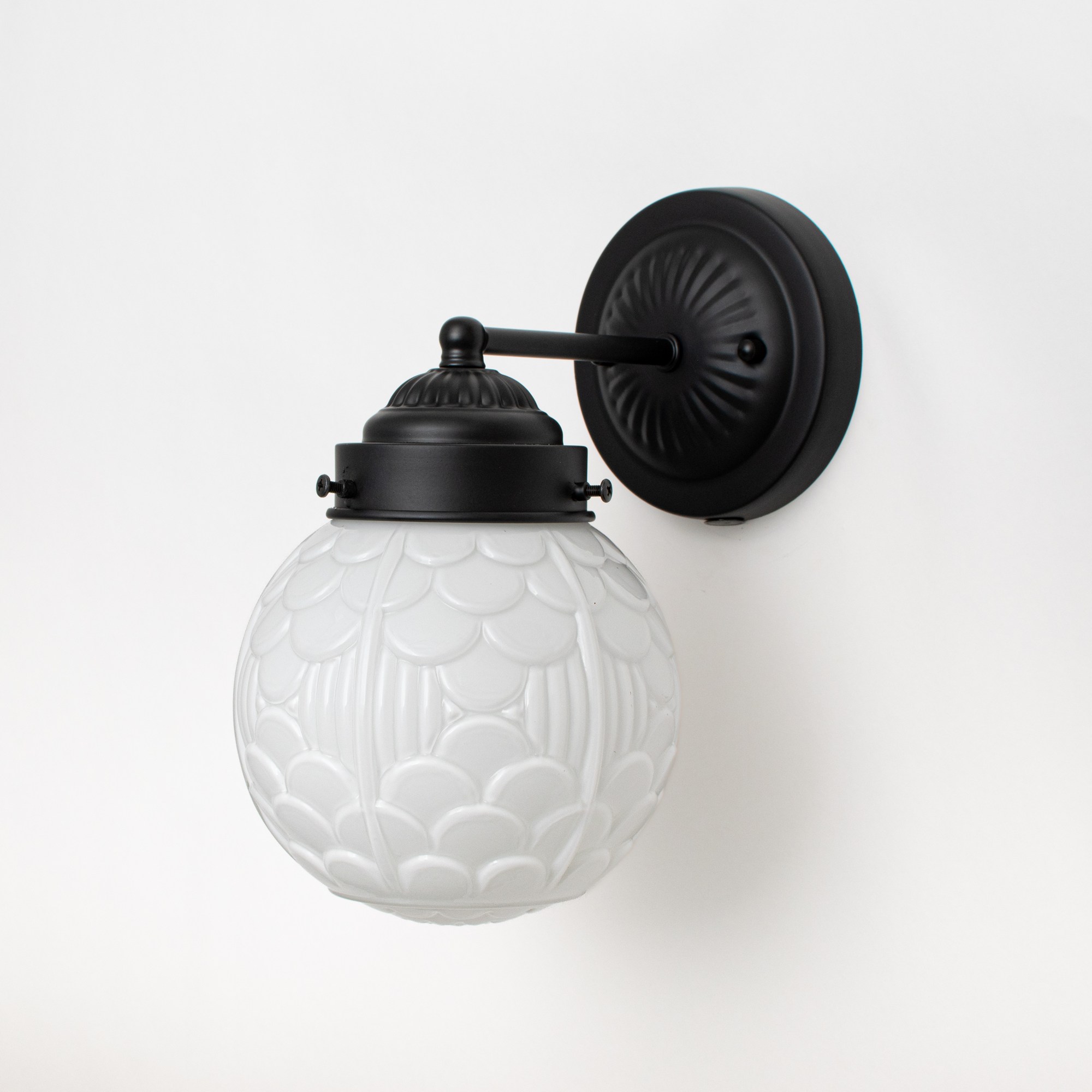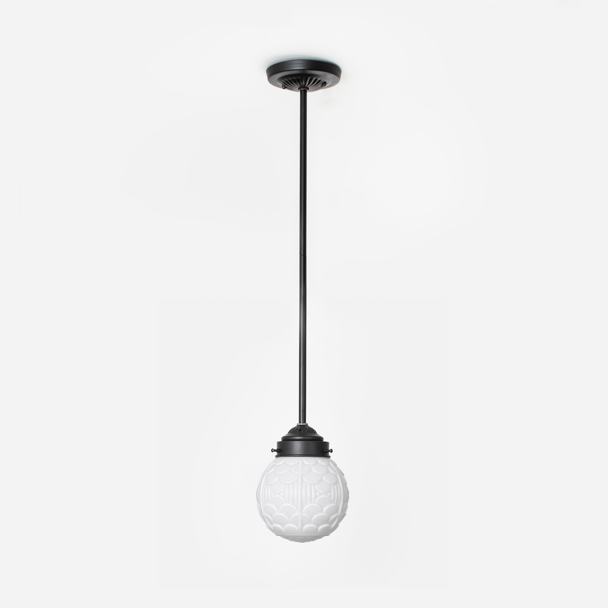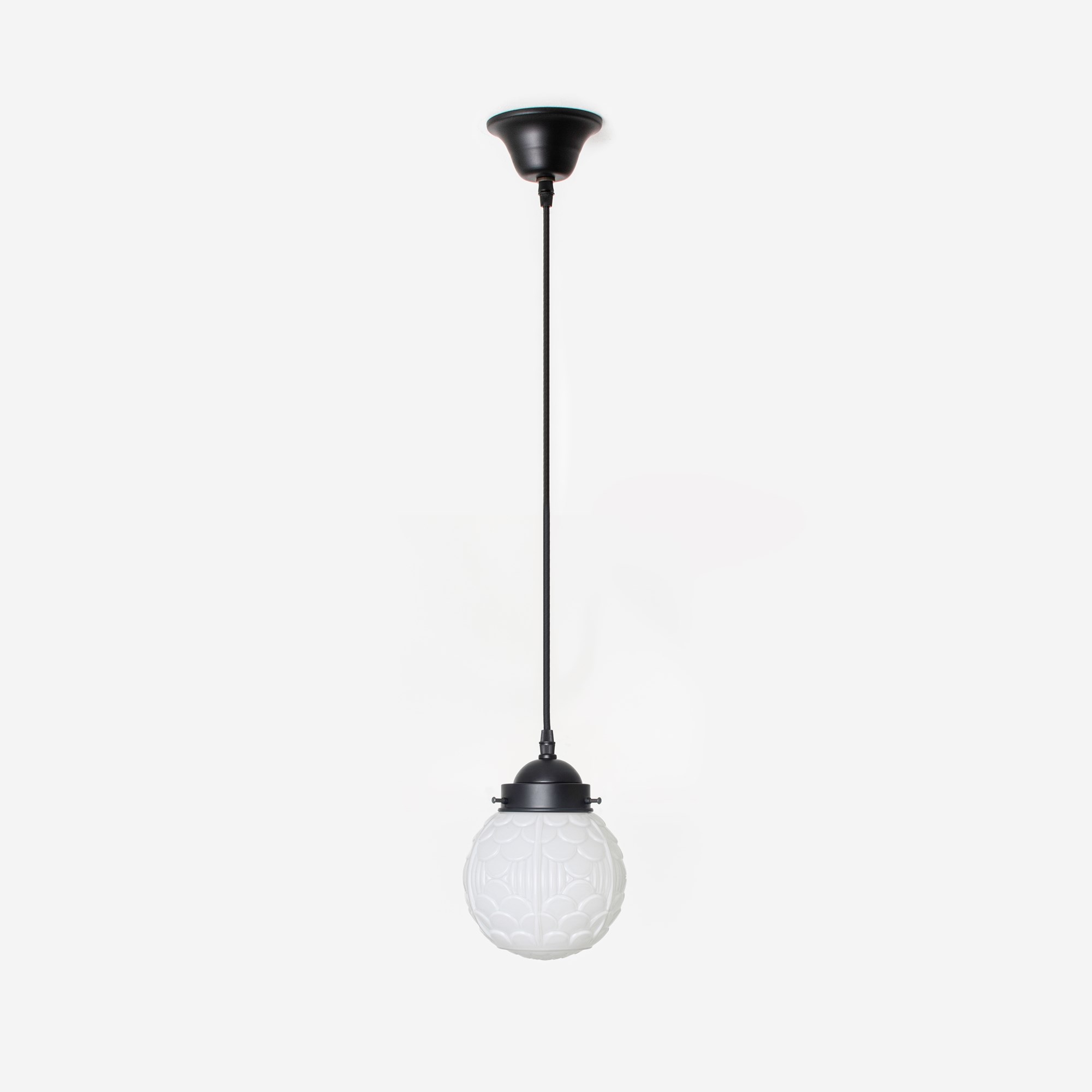 An arcade of small arches is called an arcature and is used as a decorative motif. These motifs are often seen on fabrics and wallpapers. So too on this fantastic mouth-blown glass shade in opal white.