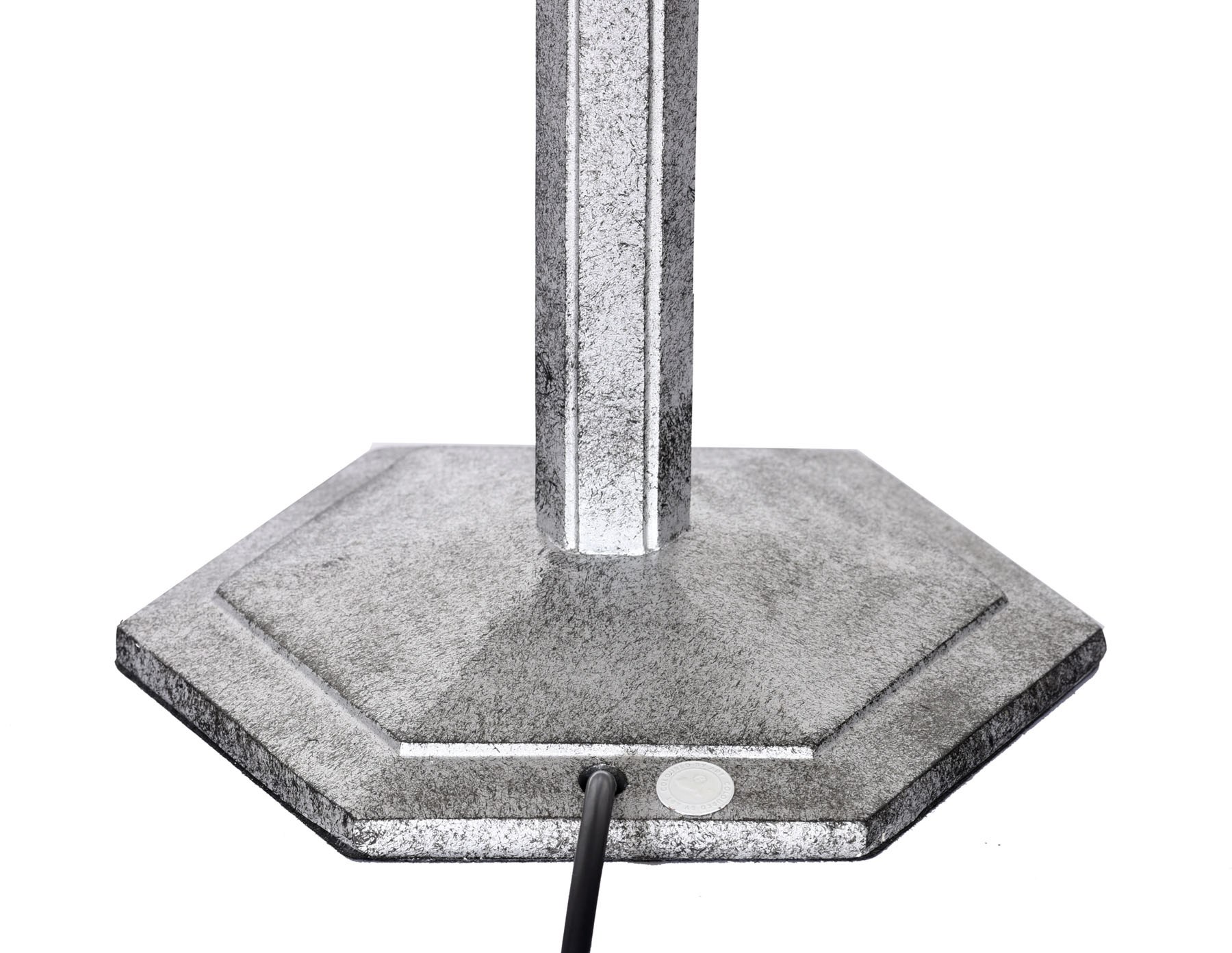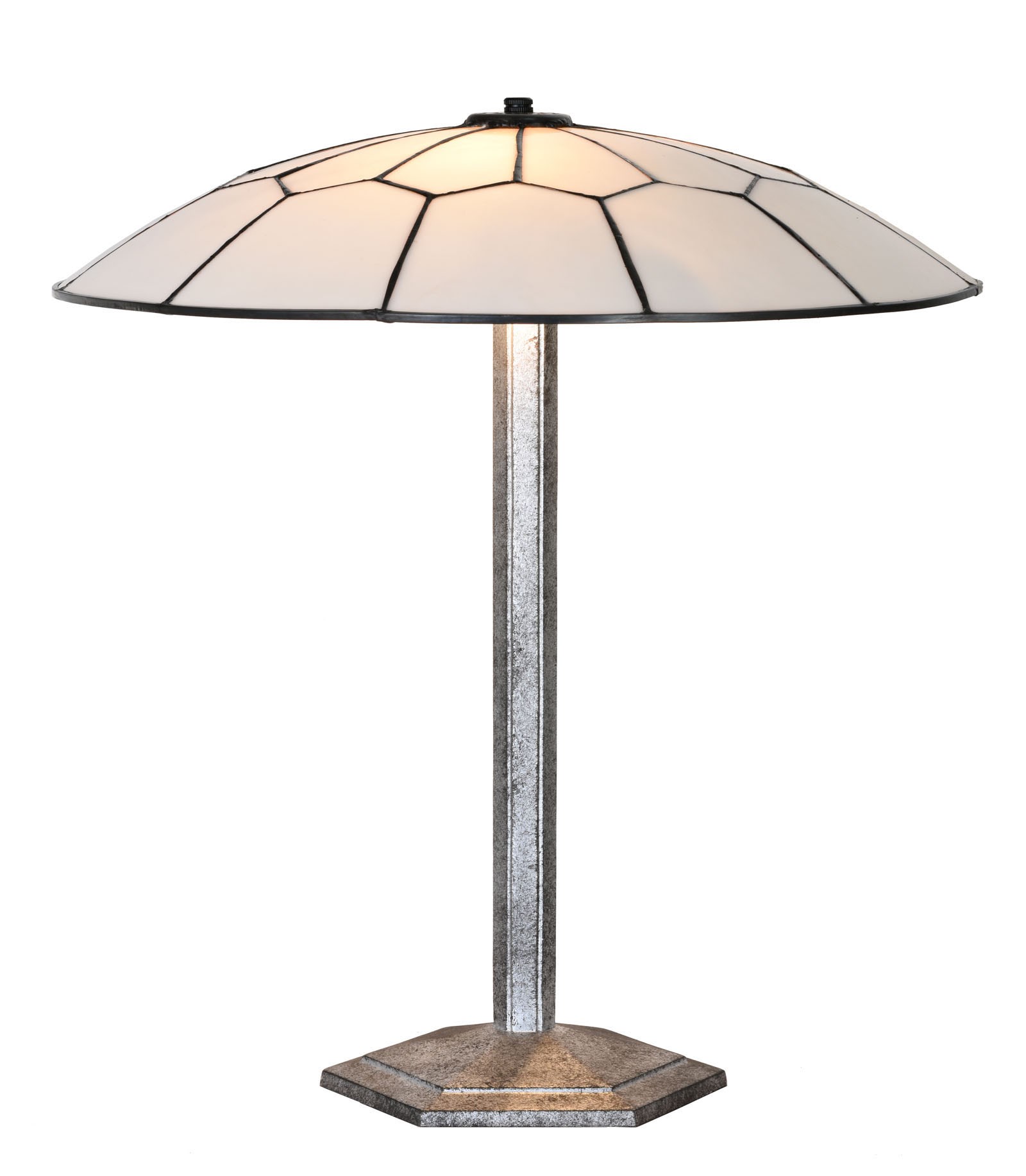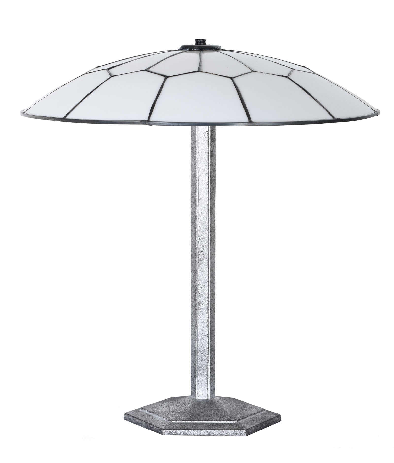 The fixture on which the glass shade rests, may also be seen: Of course a bit extravagant in a hexagonal shape. Beautiful in a silver-black patina.