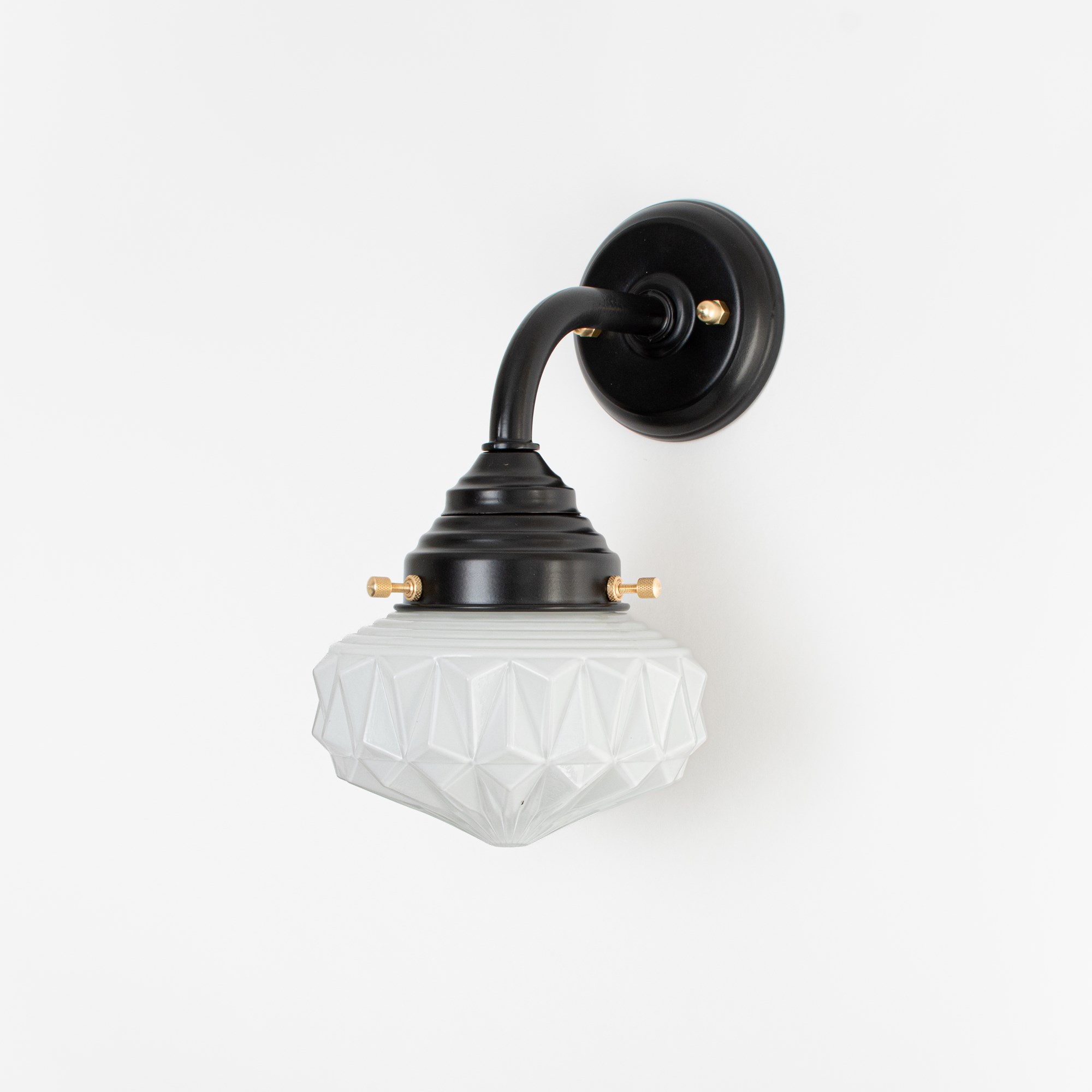 This Art Deco glass shade in opal white shines like an eternal star. Notice the intricate graphic decorative pattern that will sparkle like a diamond in the interior!