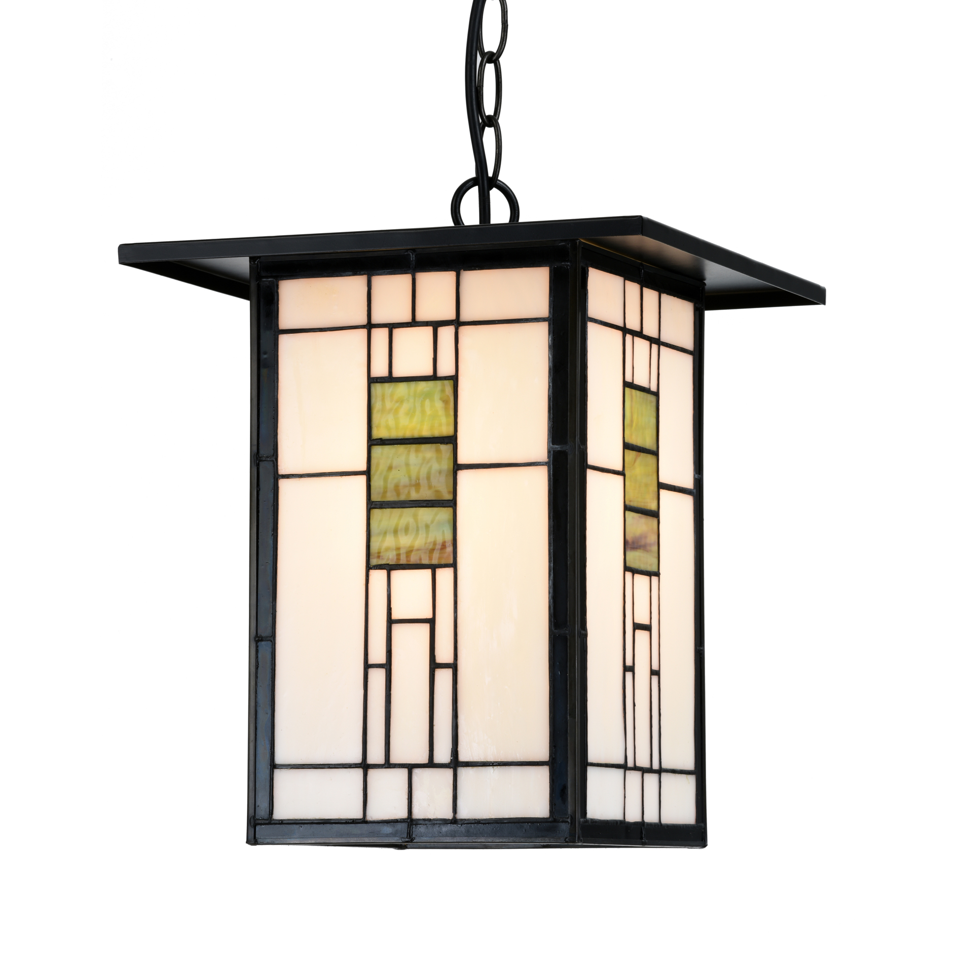 A stylish Tiffany hanging lamp in the shape of a lantern. The lamp is named after the influential architect Frank Lloyd Wright, who is known for his geometrical language of shapes and horizontal constructions. The geometry and vertical and horizontal lines can also clearly be seen in this lamp. The lamp is also reminiscent of a Japanese lantern, which is not strange since Wright let himself be inspired by Japanese architecture among other things. Its white/grey glass is combined with fiery green glass. The lamp is also perfect to hang in groups, like in a staircase for instance. It can easily be combined with Tiffany lamps and the Frank Lloyd Wright panel of the Geometric series.
